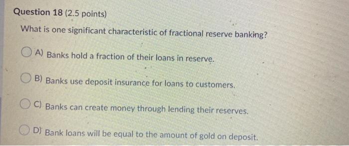 Question 18 25 points What is one significant characteristic of fractional reserve banking. What is one significant characteristic of fractional reserve banking.